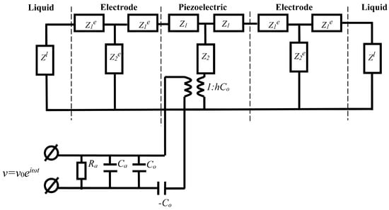 Figure 6 shows an equivalent electromechanical circuit describing a piezoelectric resonator with a longitudinal electric field completely immersed in a viscous conducting liquid. The mechanical contact of the resonator with a liquid is described by the complex impedance
