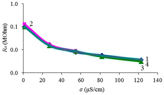 Figure 9. It can be seen that this resistance is practically independent of the volumetric content of glycerol (that is, on viscosity and permittivity) and monotonically decreases with increasing conductivity of the liquid. Therefore, this dependence can be used as a calibration curve to determine the conductivity