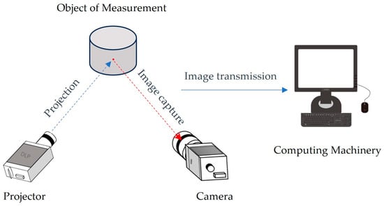 The structured light method is a three-dimensional imaging technique based on optical triangulation. As depicted in Figure 1, the structured light three-dimensional imaging system projects encoded structured light onto the surface of the object under examination using a projector. The camera captures the distorted pattern arising from the modulation of the object’s height, and the distorted pattern is subsequently demodulated using a computer. Ultimately, the three-dimensional shape of the object can be determined.
