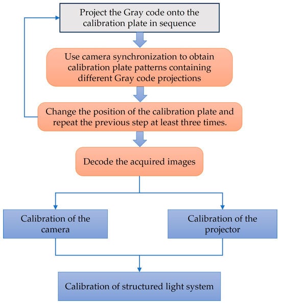 To achieve precise 3D object reconstruction, the geometric relationships and internal parameters of the structured light system play a crucial role. This necessitates calibrating the structured light system before undertaking 3D object reconstruction to establish these transformation relationships. Figure 3 illustrates the structured light system’s calibration process, comprising two components: camera calibration and projector calibration.