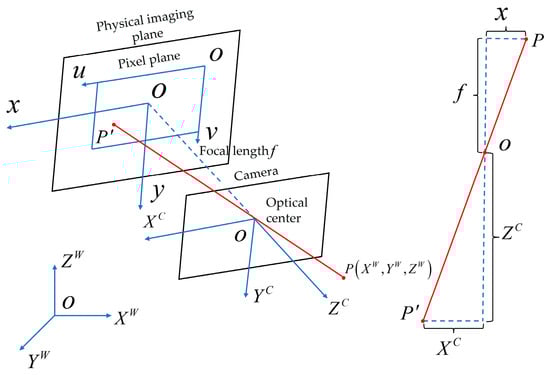 In an ideal scenario, a pinhole camera adheres to the principles of linear perspectives, as illustrated in Figure 4 []. The transformation relationship for a point on the object from coordinates in the world coordinate system to the projected coordinates in the pixel plane coordinate system is defined by Equation (3) []: