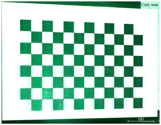 In this study, the calibration object employed is a chessboard grid calibration board with known dimensions. The world coordinate system is established by taking the plane where the calibration board is located as the plane. All corner points on the chessboard grid are situated on this plane, rendering their coordinates in the Z direction as zero []. As the dimensions of each grid on the chessboard grid are known, it enables the computation of the world coordinates for each corner point. The calibration board images are captured, and corner detection algorithms are applied to determine the pixel coordinates of each corner point in the image. Figure 5 displays the detection results of these corner points. A system of calibration equations can be established as shown in Equation (4):