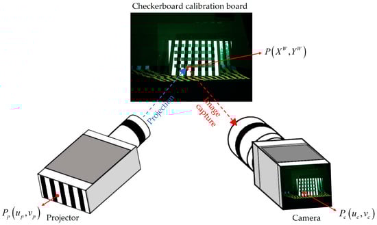As illustrated in Figure 7, assume that the coordinates of a corner point on the chessboard grid calibration plate are . Its corresponding projection on the camera imaging plane is point , with pixel coordinates . The projection of point on the projector’s projection plane is point , with pixel coordinates . As described in Section 2.1, Gray code values are uniquely assigned to each pixel in the projected image. By analyzing the position of point within the black and white stripes of a series of grayscale-encoded patterns, its grayscale code values can be determined. In this context, represents the Gray code value along the u-axis (horizontal direction), while Cv denotes the Gray code value along the -axis (vertical direction). Decoding the Gray code value of point allows us to obtain the pixel coordinates of point . Utilizing this method, the coordinates of the chessboard grid corners in the projector’s pixel coordinate system can be determined []. This subsequently enables the calibration of the projector through the application of camera calibration techniques.