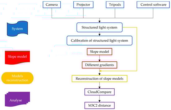 In this study, a three-dimensional-structured-light-system-based method is presented to measure the surface of slope models with different slopes, which can obtain the deformation from the three-dimensional point cloud model of the slope. The method based on the structured light system in this paper can achieve sub-millimeter accuracy in 3D reconstruction. A color-mapped deformation map derived from the slope point cloud model is established. Based on the regions corresponding to different colors in the map, the deformation of the slope models can be obtained. This can help researchers identify the positions and severity of disasters such as collapse and uplift of the slope through the model tests. Another outstanding advantage of this method is its low cost with convenient operation. The cost of the structured light system in this experiment consists of two parts: (a) hardware including projectors and cameras and (b) processing software. With the development of digital technology, low-cost digital products have become widely popular. The projectors and cameras required for this experiment only need to meet the requirements for projection and shooting, so inexpensive second-hand smartphones and simple projection devices can be purchased to form the structured light system used in this paper. The point cloud processing software CloudCompare used in this experiment is free. In general, a relatively low cost is sufficient to complete the construction of the structured light system in this experiment.