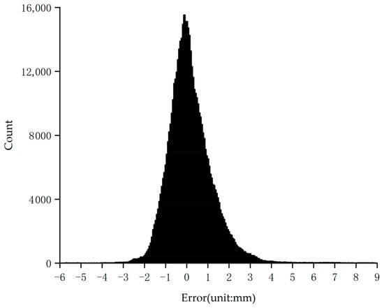 The histogram depicting the distribution of distance errors between the slope model reconstructed by the structured light system and the slope model reconstructed by laser scanning was calculated using the M3C2 algorithm.