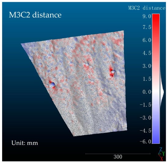 Figure 12 illustrates the distance errors between the slope model obtained using a laser scanner and the slope model acquired through the structured light system discussed in this paper. Since these two point cloud models are not in the same coordinate system, registration is necessary before any comparison. Coarse registration is required prior to precise alignment. As depicted in Figure 12, two pieces of gravel of approximately 25 mm in diameter were placed on the surface of the slope model, forming two notable protrusions. This gravel was used as feature objects for the coarse registration of the two point cloud models. The obstruction of light by the gravel prevented the structured light from projecting onto their backside and the adjacent areas. This led to missing point cloud data in these regions in the model reconstructed by the structured light system, while the laser scanner model included these data. Consequently, the lack of point cloud data in the gravel regions of the model reconstructed by the structured light system led to the most significant errors. Therefore, the largest positive and negative distance errors occur in the two gravel regions, which are indicated by the deep red areas in Figure 12.