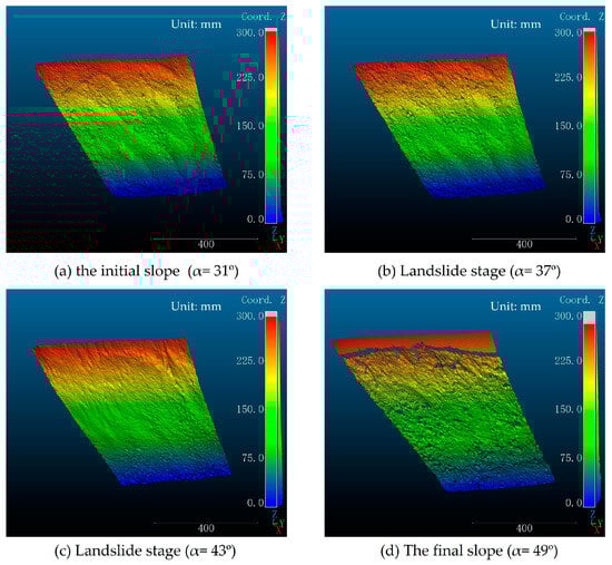 After the calibration of the structured light system, the collection of slope model images was initiated. The basic test conditions for the physical model test in this paper adhere to the standard protocol established by Fang et al. [], as illustrated in Appendix A Figure A1. In this study, the slope angle was systematically adjusted to 31°, 37°, 43°, and 49° to simulate landslide phenomena in the slope model. After stabilization of the landslide phenomenon on slopes with various inclinations, the slope angle was readjusted to the initial 31° to maintain consistency in the captured image area on the slope surface. Figure 13 illustrates the 3D models of the slope following landslide occurrences at various inclinations.