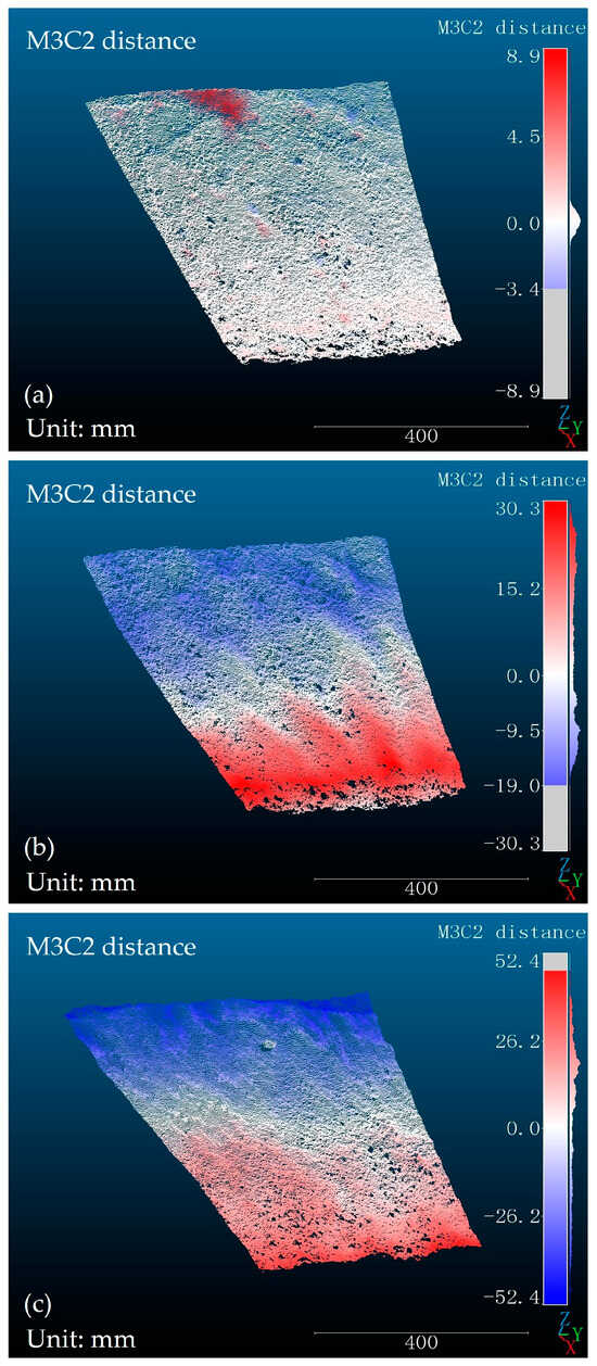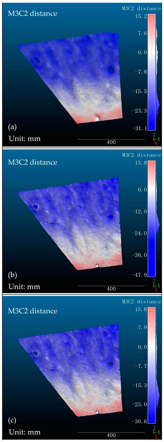 In this study, CloudCompare software was used to compute cloud-to-cloud distances. Two different algorithms are used in this software: Closest-to-Closest (C2C) distance and Multiscale Model-to-Model Comparison (M3C2). The C2C algorithm identifies the closest points in the reference cloud and calculates the Euclidean distance, allowing for a quicker completion of point cloud comparison. Nevertheless, this algorithm is sensitive to the roughness and presence of outliers in the point cloud, thereby limiting its effectiveness. Conversely, the M3C2 algorithm utilizes the local surface normals of each point’s neighborhood to calculate point cloud variations, effectively mitigating the impact of point cloud roughness and outliers on the comparison results. This algorithm enables the direct detection of changes in complex terrain on the point cloud model.