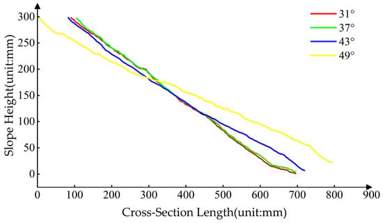 The acquired 3D point cloud data allow us to obtain cross-sections of any part of the slope model. Figure 15 depicts the cross-sectional plane of four slope models with different slopes at the red line in Figure 8. The figure allows for the observation of the general trend of landslides. Slopes ranging from 31° to 37° display minimal deformation, with overlapping slope curves. The 43° slope demonstrates an overall downward shift in comparison to the 37° slope, with the maximum height difference occurring at the slope toe. The 49° slope displays the most extensive landslide, characterized by the most pronounced trend. These findings align with the observations made at the slope model test site.