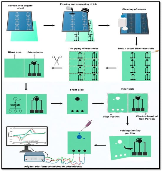 Diagrammatic stepwise representation of fabrication and construction of origami platform: starting with the placing of the origami sheet (used as a substrate) under the screen; the pouring and squeezing of carbon conductive ink used as a base on the screen for the hand printing of electrodes; the cleaning of the screen using acetone and cotton to prevent it from tarnishing; the drop-casting of the silver electrode as a reference electrode; snipping out all the electrodes and constructing cut-outs on the blank section of the flap; connecting the origami platform to the potentiostat for the electrochemical detection of DENV-Ag.