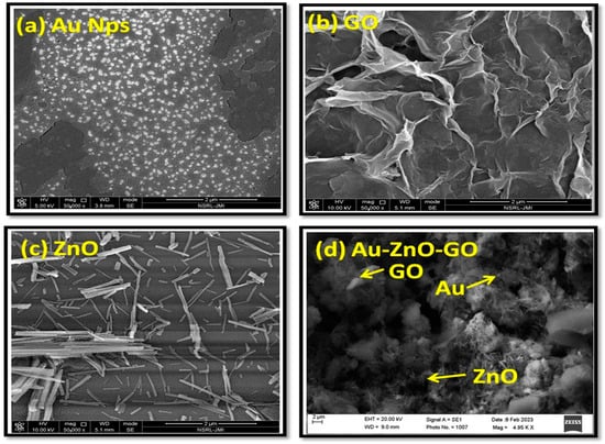 The effective preparation of Au/ZnO/GO-nanocomposites was validated via the subsequent characterization strategies: FESEM, FTIR, and UV-Vis spectroscopy, the most important tool for confirming the nanostructure’s synthesis. The morphological confirmation of the Au-modified ZnO-GO NC was investigated by FESEM micrographs. Figure 3a showed the uniformly distributed bright spheres of AuNPs with an average diameter of 30–50 nm. Figure 3b,c represent the successful formation of graphene oxide nanosheets and ZnO nanorods. The obtained ZnO nanorods have an average length of 500 nm with a diameter of 50 nm. Figure 3d showed the presence of Au nanoparticles distributed evenly between ZnO nanorods and graphene oxide nanosheets, respectively.