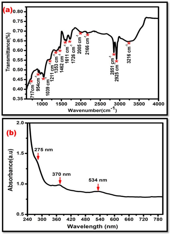 (a) Fourier transform infrared (FTIR spectrum) spectroscopy of AU-ZnO-GO NC with strong peaks at 2925 cm−1 and 2851 cm−1, due to the reduction of Au3+ to Au0. (b) UV-Vis absorption spectrum of Au-modified ZnO-GO NC, showing characteristic peaks at 275 nm, 370 nm, and 534 nm.