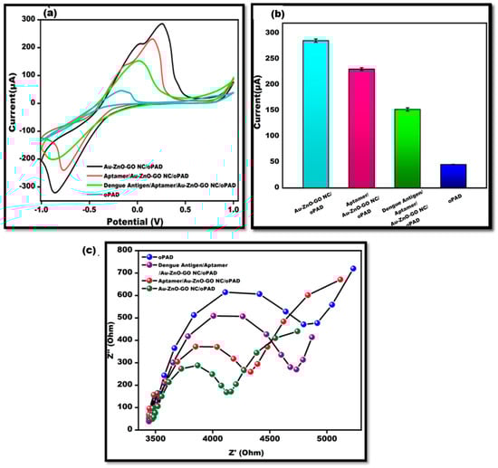 The electrochemical cyclic voltammetry approach was used to characterize the electrochemical properties of DENV-Ag-Apt/Au/ZnO/GO-NC/OBA-modified electrodes. Figure 5a depicts the CV-validated differential current response at various phases of the electrode. The CV-bare electrode (oPAD) had a lower current response, which can be ascribed to slower electron transfer kinetics. The rapid electron transfer kinetics given by Au/ZnO/GO-NC resulted in the more-than-sixfold amplification of the current responsiveness upon the deposition onto the working surface. Due to the non-conducive nature of the aptamer, the current is intensely decreased after the immobilization of the bio-receptor (Aptamer) onto the working surface. The current response was further reduced with the addition of antigen. The hybridized antigen–aptamer substantially lowered the current response. Figure 5b shows the bar graph of CV analysis. (Table 1 Depicts the current range). In Figure 5c, the electrochemical impedance spectroscopy, i.e., EIS, was also employed to investigate the surface behavior of the modified electrode of origami-based aptasensors for the detection of DENV. The semi-circle arc represented electron transmission in a restricted way at higher frequencies, whilst the linear component of the graph represented diffusion behavior at lower frequencies.