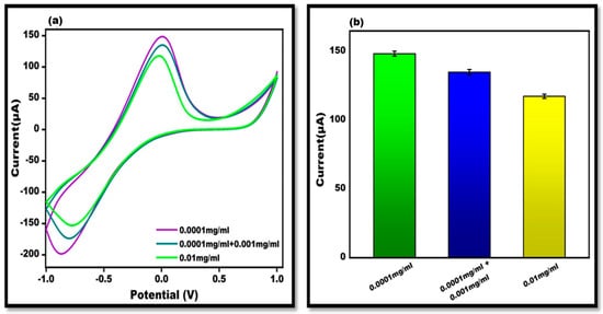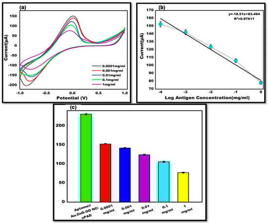 To demonstrate the quantitative capability of the proposed aptasensor, various antigen concentrations were examined. Since research is conducted globally in the concentration range of 0.0001 mg/mL to 1 mg/mL, a broad concentration range from this range was employed for aptamer binding. The findings demonstrate the antigen hybridization with the aptamer and varying current responses at various concentrations, validating the proposed sensor’s quantitative performance. The acquired results were consistent with the previously reported sensors. Increased antigen concentrations resulted in a lower current response because electron transfer was hindered by the increased biological recognition element insulating layers. It was discovered that the detection limit was 102 ng/mL. Electrochemical measurements were used to confirm all these prepared concentration values (Figure 6).