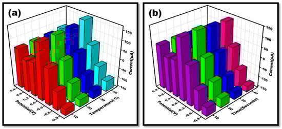 Three-dimensional illustration of cyclic voltammetry achieved at DENV-Ag-Apt/Au/ZnO/GO-NC/oPAD for (a). Different temperatures ranging from 10–40 °C in 10 mM Methylene blue dissolved in 0.1 M KCl at 50 mVs−1. (b). Time (tcond ranging from 10–40 s) in 10 mM Methylene blue dissolved in 0.1 M KCl at scan rate 50 mVs−1.