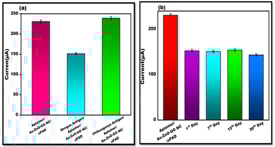 (a). Evaluation of peak current CV value of DENV-Ag-Apt/Au/ZnO/GO-NC/oPAD binding with the interferent, CHIKV-Ag with an error bar, n = 5. (b). The stability of the developed OBA was evaluated using the electrochemical test for dengue antigen on the 4 weeks with error bar (n = 5).