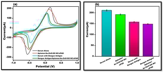 To authenticate the accessibility of the constructed origami-based aptasensor, the possibility that the proposed platform for detecting dengue antigens in human serum samples was evaluated using a standard addition procedure. Peak current cyclic voltammetry value testing was performed after spiking 0.1 mg/mL dengue antigen in the human serum to the surface of Apt/Au/ZnO/GO-NC/oPAD (Figure 10a,b). The sensor performed well in samples of human serum, and the reaction was essentially similar to that of the DENV polyvalent antigen. Data from the actual sample that fulfilled the requirements for identification were obtained, demonstrating the sensor’s efficiency.