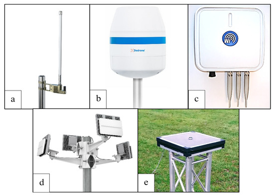 Sensors of different types: (a) ADS–B receiver [18], (b) radio frequency sensor [19], (c) remote ID receiver [20], (d) radar [21], and (e) acoustic sensor [22].
