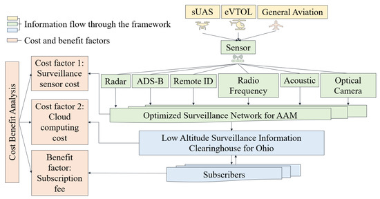 Contributions: In this study, the optimized AAM surveillance network is connected to LASIC, efficiently handling AAM surveillance data generated through sensor tracking and detection of AAM traffic. This integration is considered based on AAM traffic projections, surveillance data types, interface standards, data sizes, ping rates, and cloud components. An overview of the optimized AAM surveillance network and LASIC framework and its associated cost and benefit factors are illustrated in Figure 2. Based on a survey of the present AAM sensor market, we selected six different sensor types: a radar, radio frequency sensor, ADS–B, remote ID, optical camera, and acoustic sensor. The surveillance and telemetry data associated with sUAS, eVTOL, and general aviation traffic—such as position, velocity, flight intent, and remote identification—can be captured and generated by the optimized surveillance network, allowing the aircraft movement in the airspace to be tracked. This surveillance data can then be ingested into LASIC, which will provide the subscribers of LASIC with information about scheduled and real-time AAM operations and relevant airspace activities so that they may plan for their flight operations accordingly. The subscribers of LASIC will potentially include AAM operators engaged in different AAM use cases such as passenger and cargo transportation, bridge inspections, medical delivery, etc., as well as airspace service providers, law enforcement agencies, correctional facilities, and municipalities.
