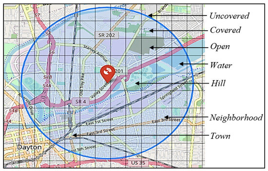 The probability of detecting an AAM aircraft flying over a given block by a given sensor type is determined by the terrain type of that block. Let T be a set of terrain types associated with each block in within the mesh for a given area, and S be a set of potential sensor types. The detection probabilities for all combinations of terrain types and sensor types is represented by the matrix . represents the terrain type of the z-th block in T, and s is the index for the sensor-type set S. The probability of detecting an AAM aircraft, denoted by , with a sensor of type s on block is represented as follows: