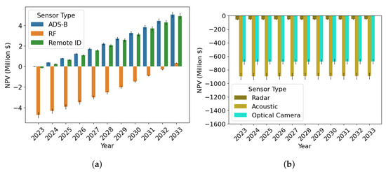 - We conducted a rigorous cost–benefit analysis of the proposed AAM surveillance network and LASIC implementation for the State of Ohio to determine the break-even points for different sensor types. We considered the uncertainty associated with AAM demand to determine the possible range of costs, revenue, and NPV for the AAM surveillance network and LASIC.