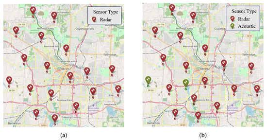 - Dhillon, S.S.; Chakrabarty, K.; Iyengar, S.S. Sensor placement for grid coverage under imprecise detections. In Proceedings of the Fifth International Conference on Information Fusion. FUSION 2002 (IEEE Cat. No. 02EX5997), Annapolis, MD, USA, 8–11 July 2002; Volume 2, pp. 1581–1587. [Google Scholar] [CrossRef]