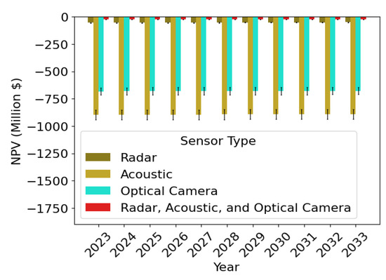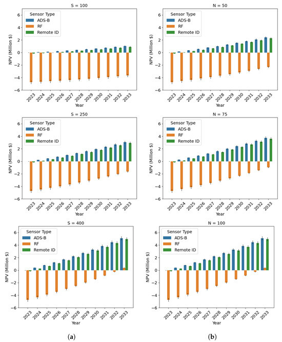 Because of the uncertainties in AAM demand and the significant influence of certain parameters on the results, such as the LASIC subscription fee, number of initial subscribers, terrain-based sensor detection probabilities, and minimum required detection probability, we performed a sensitivity analysis. This analysis aimed to observe how changes in these parameters impact the results. The analysis indicates that an increase in terrain-based sensor detection probabilities leads to a decrease in the required number of sensors and total sensor cost, while a decrease in detection probability has the opposite effect. The analysis also reveals that an increase in the minimum required detection probability leads to an increase in both the number of sensors required and the total sensor cost, with the acoustic sensor type being the most affected and the ADS–B sensor type being the least affected. Furthermore, the analysis shows that higher values of subscription fees and numbers of subscribers lead to increases in the NPV generated by LASIC and cause the BEP with respect to the NPV to occur earlier, as they increase revenue generation.