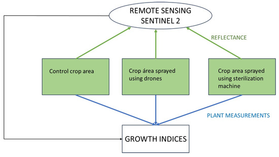 Nowadays, it is possible to use remotely sensed hyperspectral imagery to classify weeds [32,33] and to monitor weed growth based on chlorophyll content and plant cover [34], making it possible to monitor herbicide applications using both drones and sterilizing machines. Therefore, the objective of this work is to study the effectiveness of remote sensing to verify the possible improvement in the application with drones of a herbicide with the active ingredient cyhalofop-butyl compared to its application with sterilizing machines for the control of Echinochloa spp. in rice crops in Valencia, maintaining yield and minimizing rice toxicity by the herbicide. As it is a natural park with special protection, the use of phytosanitary products is limited and highly controlled. Therefore, the application of phytosanitary products must be as effective as possible to minimise phytosanitary residues in the park.