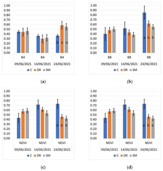 During the first two moments of recording reflectance values in B4 and B8 (9 and 14 June), no significant differences were found between the different herbicide application systems and the control. However, a slight change in the reflectance of the spectral bands was observed in the control treatment between 9 and 14 June, with a decrease in the B4 band and an increase in the B8 band. This trend was confirmed by the record made on June 24. At this time, statistically significant differences were observed between the two application methods (DR and SM) and the control. A lower reflectance value was observed in B4 in the control plots (C), with statistically significant differences (p < 0.05) compared to the DR and SM plots and no statistically significant differences between DR and SM.