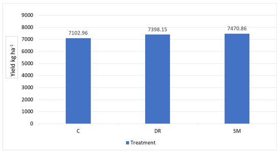 Marketable rice production yield estimate per treatment for each treatment group (C, DR, SM), according to [40].