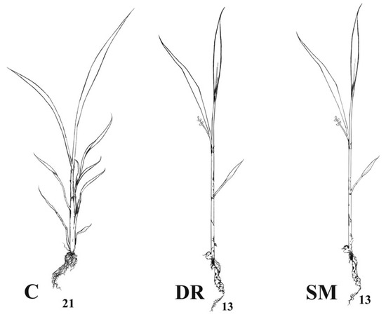 As for the phenological stages visualised in the rice, these corresponded to what is expected for the crop at each time point, and like the leaf area, they did not reflect symptoms of phytotoxicity. Regarding the Echinochloa spp. plants, their phenological stages 14 days after sowing (7 days after treatment) already showed evidence of the treatment’s efficacy. In the subplots treated with DR or SM, there was no tillering of the weed plants, while in the control plots, one or two tillers were already showing.