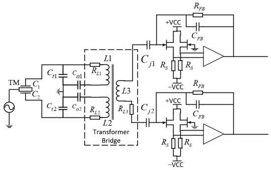 The test mass (TM) and two-electrode plates of the sensor constitute capacitor and capacitor , which is referred to as a nominal capacitor when the TM is in the central position, such that , and denotes a nominal capacitor. When the TM moves in parallel between the two parallel electrode plates, a capacitance difference between the two plates is generated such that the sensing bridge and the current in the two primary windings of the transformer are unbalanced. The presence of an unbalanced current in the primary windings of the transformer induces a differential voltage in the secondary windings, which is directly proportional to the gain of the sensing circuit and the displacement of the TM relative to the center position between the two plates. The TIA circuit will further amplify the signal. Specifically, and are tuning capacitors, and the circuit operates at the resonant frequency to minimize noise by adjusting the size of the tuning capacitor [14]. In addition, and are drive capacitors, . The transformer incurs a loss , , where denotes the transformer’s quality factor and denotes the transformer’s inductance. The expression for the actual inductance is given by .