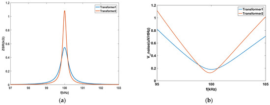 The simulated and analyzed output impedances of the bridge circuit corresponding to transformers 1 and 2 with different parameters are given. At a frequency of 100 kHz, the bridge’s equivalent impedance for the two transformers reaches significantly different maximum values, namely 544.3 kΩ and 1085 kΩ, respectively. The impedance exhibited a rapid decrease when the frequency deviates from 100 kHz. The output voltage noise of the bridge and the TIA were determined using Equation (2). Figure 3b shows the output voltage noise when transformers 1 and 2 were employed.