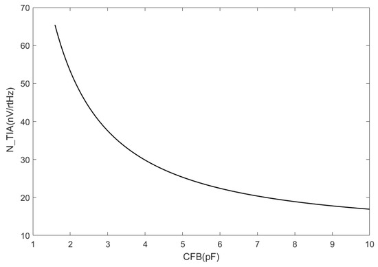 However, it is important to note that the TIA circuit must ensure proper amplification of the capacitor with the current flowing through the feedback capacitor as opposed to the feedback resistance. Hence, the impedance of the feedback capacitor must be significantly lower than that of the feedback resistor. These requirements are generally fulfilled by . The variation in the TIA noise is shown in Figure 7.