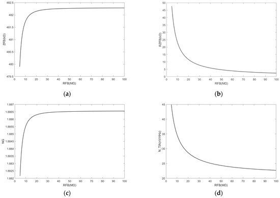 (a) Increase in feedback resistance leads to a corresponding increase in the feedback impedance, although the magnitude of the change is minimal; (b) The real part of the feedback impedance decreases when the feedback resistance increases; (c) Increase in the feedback resistance leads to a corresponding increase in noise gain, although the magnitude of the change is minimal; (d) The TIA noise decreases when the feedback resistance increases based on the real part of the feedback impedance.