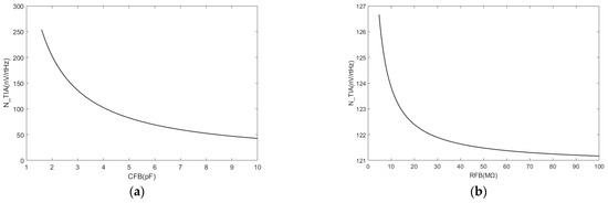 (a) TIA noise decreases when the feedback capacitance increases; (b) TIA noise decreases when the feedback resistance increases, although the variation remains within a range of less than 6 nV/rtHz.