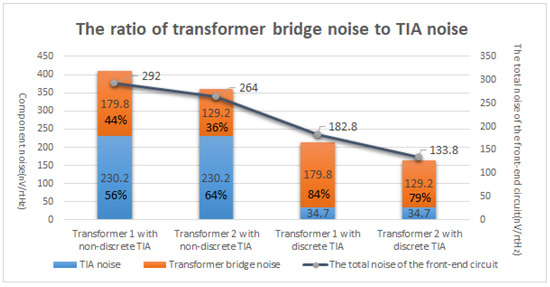 The absence of a JFET in the TIA circuit results in a higher amplifier current noise, and thus the manifestation of a transformer noise reduction is not adequately demonstrated. After optimizing the TIA circuit, the noise of transformer 2 exhibited a decrease of 73% when compared to that of transformer 1. Therefore, when the inherent noise of the TIA circuit is mitigated, the contribution from the transformer noise becomes pivotal in determining the overall circuit noise.
