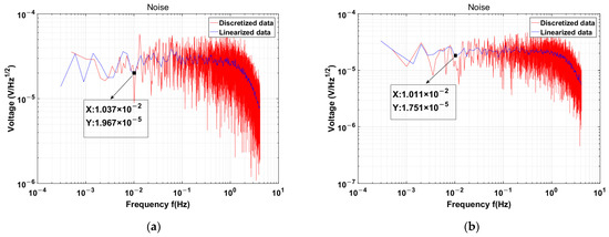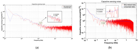 (a) The capacitive sensing resolution test using transformer 2 and a non-discrete TIA is 1.095 aF/rtHz at 10 mHz [19]; (b) The capacitive sensing resolution test result is 0.84 aF/rtHz at 10 mHz using a discrete TIA with transformer 2.