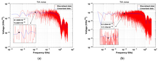 The utilization of a JFET as an input stage in TIA circuits leads to a significant decrease in TIA noise, from 230.3 nV/rtHz to 34.71 nV/rtHz, which represents only 15% of the former value. The noise performance was verified in the configuration with the open TIA input, and the results are shown in Figure 11. After normalization to account for circuit gain discrepancies, the discrete TIA noise decreases from 41.1 uV /rtHz to 7.17 uV /rtHz, as listed in Table 4, which represents approximately 17.4% of its initial value and is closely aligned with theoretical calculations. The gain calibration curves are shown in Figure 12.