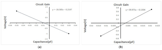 (a) The non-discrete TIA circuit gain test result is 26 V/pF, (b) The discrete TIA circuit gain test result is 40 V/pF.