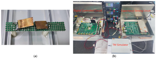 The resolution of the capacitive sensing is directly proportional to the output noise of the capacitive sensing circuit, where the gain of the circuit serves as the proportionality factor. The carrier amplitude is set to 1.2 Vp and the input of the capacitive sensing circuit is provided by the TM simulator. As shown in Figure 13a, an air capacitor consisting of two copper sheets served as the input. Following calibration using an AH2700A capacitor bridge, the resulting tolerance was 4.6 fF. The test involved the utilization of transformer 2 and a discrete TIA, and the corresponding experimental setup is shown in Figure 13b.