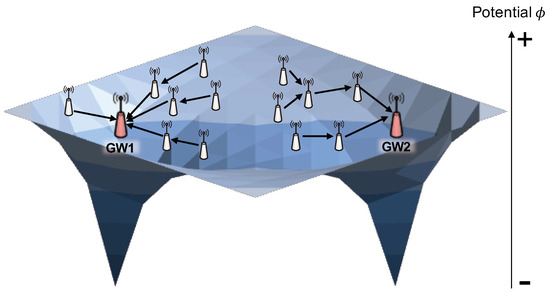 ALFA is a field-based routing protocol designed based on Poisson’s equation in physics, which models a distribution of electric fields across a region. This protocol design relies on a conceptual mapping between physics and network fields as follows: the medium in physics corresponds to mesh nodes in the network, (−) pole charges are analogous to mesh gateways, and (+) moving charges represent packets. According to this conceptual mapping relationship, the movement behavior of (+) moving charges towards (−) pole charges can be interpreted as the forwarding behavior of packets towards gateways. To provide a more detailed description, repulsion forces among (+) moving charges can be associated with congestion levels by packets, while attraction forces between (+) moving charges and (−) pole charges can be related to the consideration of the short path. This protocol metric shown in (3) is derived using the finite element method (FEM) [17], a widely used technique in designing distributed algorithms.