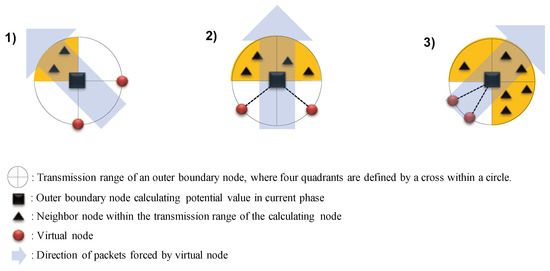 We explain how to arrange virtual nodes for implementing the Robin boundary conditions and discuss their effects. All mesh nodes inspect the deployment of their neighbors and calculate potential values by placing a few virtual nodes based on the inspection results. To illustrate, we consider the scenarios shown in Figure 2. In the first case, neighbors are present only in the second quadrant. Initially, a mesh node identifies itself as an outer boundary node based on the proposed outer boundary node definition. Subsequently, it arranges virtual nodes as if they were non-existent but virtually within its transmission range. The highest fixed potential value is assigned to these virtual nodes. The outer boundary node then calculates potential values with the same considerations as general mesh nodes, leading to packet movement to the network interior direction from the outermost edges of the network, as indicated in Figure 2. The second and third cases follow the same principles as the first case, with the only distinction for the placement of virtual nodes, depending on the arrangement of neighbors. As depicted in the figure, virtual nodes are positioned along the boundary in the quadrants opposite to where actual mesh nodes are deployed. However, the conditions and methods illustrated in the figure for arranging virtual nodes along the boundary in the opposite quadrants are just one specific example, and they can be flexibly adjusted at the discretion of the network operator.