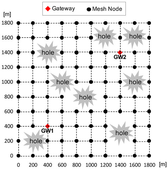 We begin by examining the results for the grid regular network topology with holes, which represents the simplest scenario, as shown in Figure 3. Note that the areas labeled as hole in the figure are just one example. In actual simulations, these holes were randomly selected. Simulations are conducted with a 30% offered traffic load generated by randomly selecting 10 mesh nodes.