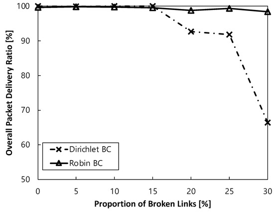 Finally, the performance of the proposed ALFA by Robin boundary conditions (referred to as Robin BC) is significantly better than the conventional ALFA with Dirichlet-based boundary conditions (referred to as Dirichlet BC) as the ratio of broken links increases, with a maximum difference of 48% in terms of the overall packet delivery ratio. Specifically, up to a broken link ratio of 15%, there is little difference in performance between the two schemes. However, the performance gap begins to widen: at 20%, it is 7%; at 25%, it is 8%; and at 30%, it increases to 48%. The reason is that a routing field is not normally converged due to the absence of a sophisticated method to calculate potential values at the vacant regions by the existing simple Dirichlet-based boundary conditions to assign a fixed potential value to boundary nodes. On the other hand, there is no such limitation imposed by the proposed boundary conditions, as all the boundary nodes can better adapt to various situations by establishing a stable routing field in any scenario. In other words, ALFA with the proposed boundary conditions is more robust for the networks with holes.