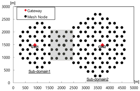 Next, we conduct simulations in a non-grid regular network topology with several holes to evaluate the proposed outer boundary conditions, similar to the grid scenario. In detail, we consider a non-grid regular network consisting of 154 mesh nodes and two gateways distributed across two sub-domains, with each sub-domain having a gateway deployed, as shown in Figure 5. These sub-domains consist of one small domain (referred to as sub-domain 1) and one large domain (referred to as sub-domain 2). The holes within the network are randomly generated with a broken link ratio of 30% per simulation run. We randomly select 10 mesh nodes at the intersections (highlighted in grey) of the sub-domains to create a congested hot spot by generating highly loaded traffic with an 80% offered load. Additionally, background traffic with a 10% offered load is generated by randomly selected 20 nodes, excluding the 10 mesh nodes chosen for generating highly loaded traffic at the intersections of sub-domains.