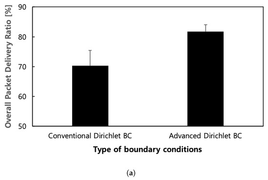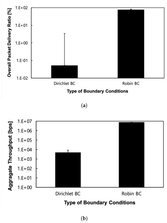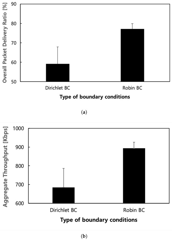 Performance according to the kind of outer boundary conditions in the Google WiFi network topology. (a) Overall packet delivery ratio; (b) Aggregate throughput.