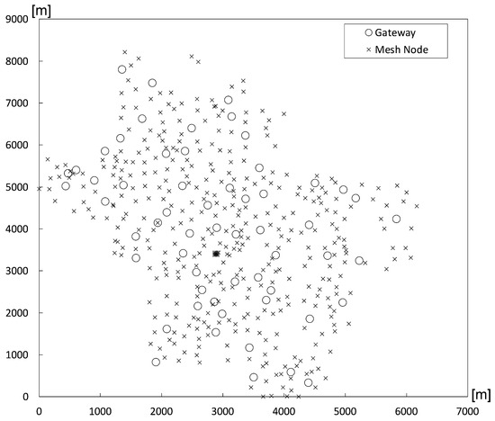 As our simulation parameters, we set the maximum queue size to 100, and is set to , which is empirically obtained when the best performance is observed through various simulations. All data packets are UDP packets with 1000 bytes, and the packet generation follows a Poisson distribution with a rate under the channel bandwidth of 2 Mbps. While it is possible to set arbitrary numbers directly as the packet generation rate without any specific qualitative meaning, we introduce an offered load expressed as a percentage to determine the rate in the Poisson distribution. Specifically, in an ideal scenario without contention, we simply consider the maximum network-wide allowable load as 100%, calculated as the product of the channel bandwidth and the number of gateways. We then adjust the Poisson distribution rate to align with the specified offered load, which results from UDP packet generation by all source nodes. This calculated rate is then applied to the simulation. However, it is up to the user’s discretion to choose how to set the rate. The transmission range and interference range are set to 250 m and 550 m, respectively. We also enable RTS/CTS and hello-message-jittering. Default values are applied to any other parameters or models not explicitly mentioned. To analyze the effects of our proposal, we measure the packet delivery ratio and throughput over a 600-s period in the middle of a 1000-s simulation. To ensure the reliability of the results, all simulations are repeated 10 times per scenario, and the averages are used in the graphs, with the standard deviation represented as vertical bars.