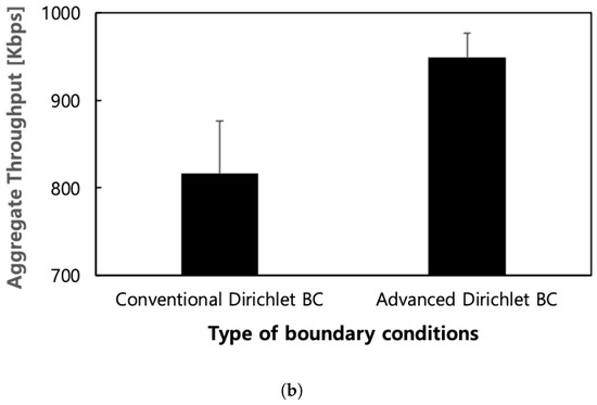 As shown in Figure 6, the protocol with fine-grained Robin boundary conditions exhibits superior performance to the protocol with coarse-grained Dirichlet boundary conditions, achieving an aggregate throughput exceeding 200 Kbps and increasing the packet delivery ratio by 17% on average. Additionally, the proposed scheme, corresponding to the former, demonstrates approximately three times better performance in standard deviation compared to the latter, corresponding to the conventional scheme in terms of both the overall packet delivery and aggregate throughput. This indicates that the protocol with coarse-grained Dirichlet boundary conditions performs poorly in networks with holes because the holes obstruct the diffusion of potential. As a result, the routing field is constructed unstably. In contrast, the protocol using fine-grained boundary conditions exhibits particular strength in networks that include holes as it can stably achieve potential field convergence in any scenario.