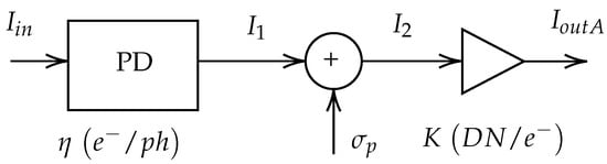 Both models are employed to maintain a realistic image creation process while isolating the sources of noise. The operation of the sensor, common to both models, is described based on Figure 1 and Figure 2. Images enter the device associated to a given amount of photons () and interact with the photodiode (PD), which transforms the photons to electrons with a quantum efficiency factor (). The result of this transformation carried out by the photodiode can be quantified as accumulated electrons. The Full Well Capacity () is defined as the maximum accumulation capacity for any given pixel. The equation that governs the transformation of photons into pixels reads: